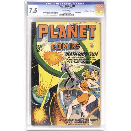 <B>Planet Comics #43 Davis Crippen ("D" Copy) pedigree (Fiction House, 1946) CGC VF- 7.5 Off-white pages.</B></I> Our fine "D" copy run continues with this issue, the first appearance of Futura. That character was a secretary from Earth who became a heroine on Venus (a female Flash Gordon of sorts). The strip was signed "John Douglas," a name some say was a pseudonym for Rafael Astarita. Overstreet 2006 VF 8.0 value = $500. CGC census 6/06: 4 in 7.5, 12 higher. <I>From the Crippen Collection.</B></I> <BR><BR><B>Important notice:</B> Heritage usually auctions material at the rate of 200-250 lots per hour. On some occasions eBay Live bid software or the Internet may not be able to keep up with the pace of the auction. We recommend placing a realistic absentee bid now as insurance to avoid disappointment. Occasionally the auctioneer may eliminate or reject an eBay Live bid, and the auctioneer may also reopen a lot after the close of the eBay live bidding (usually because we missed an audience bid), and may reject your bid even if it shows you as the winning bidder. By bidding via eBay Live, you agree that Heritage may award the lot to another bidder at its sole discretion under the circumstances described above or any other reasonable circumstances. Since eBay bids are not shown to us until we open the lot on the floor, we treat those bids just like floor bids. In most cases the floor responds before the eBay bid is presented to us, due to Internet lag time, so for consistency we have made it a policy that floor bids are always considered first over tie eBay live bids. Also please note that all Heritage lots purchased through eBay Live carry a 22.5% Buyer's Premium. Please make sure you read the Terms and Conditions before you bid. This lot is being auctioned in conjunction with a live floor auction by Heritage Auction Galleries. All final auction and invoice information will be supplied by Heritage Auction Galleries, and all other information should be considered preliminary. Lot:41001 <BR><BR><B>Winning Notification and Billing:</B> After the FINAL session in this auction is complete, Heritage will send e-mail and snail mail invoices. This process normally takes several days. All final auction and invoice information will be supplied by Heritage Auction Galleries, and all other information should be considered preliminary. <BR><BR>This auction will be conducted on a live auction floor and over the Internet through eBay Live. If you choose to place an absentee bid, please take a moment to <font color='#0000ff'><u><a href='http://pages.ebay.com/liveauctions/help/before/laabsentee.html'>learn how eBay Live absentee bidding works</a></u></font><font color='#000000'>