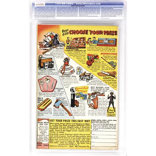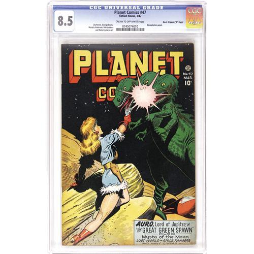 <B>Planet Comics #47 Davis Crippen ("D" Copy) pedigree (Fiction House, 1947) CGC VF+ 8.5 Cream to off-white pages.</B></I> One of Joe Doolin's best covers is not that easily found in high-grade, owing to the "black-of-space" background that tends to accentuate the tiniest of flecks and other wear. George Evans and Murphy Anderson contributed interior art. CGC notes that there's a decapitation panel in the issue. Overstreet 2006 VF 8.0 value = $388; VF/NM 9.0 value = $612. CGC census 6/06: 2 in 8.5, 4 higher. <I>From the Crippen Collection.</B></I> <BR><BR><B>Important notice:</B> Heritage usually auctions material at the rate of 200-250 lots per hour. On some occasions eBay Live bid software or the Internet may not be able to keep up with the pace of the auction. We recommend placing a realistic absentee bid now as insurance to avoid disappointment. Occasionally the auctioneer may eliminate or reject an eBay Live bid, and the auctioneer may also reopen a lot after the close of the eBay live bidding (usually because we missed an audience bid), and may reject your bid even if it shows you as the winning bidder. By bidding via eBay Live, you agree that Heritage may award the lot to another bidder at its sole discretion under the circumstances described above or any other reasonable circumstances. Since eBay bids are not shown to us until we open the lot on the floor, we treat those bids just like floor bids. In most cases the floor responds before the eBay bid is presented to us, due to Internet lag time, so for consistency we have made it a policy that floor bids are always considered first over tie eBay live bids. Also please note that all Heritage lots purchased through eBay Live carry a 22.5% Buyer's Premium. Please make sure you read the Terms and Conditions before you bid. This lot is being auctioned in conjunction with a live floor auction by Heritage Auction Galleries. All final auction and invoice information will be supplied by Heritage Auction Galleries, and all other information should be considered preliminary. Lot:41001 <BR><BR><B>Winning Notification and Billing:</B> After the FINAL session in this auction is complete, Heritage will send e-mail and snail mail invoices. This process normally takes several days. All final auction and invoice information will be supplied by Heritage Auction Galleries, and all other information should be considered preliminary. <BR><BR>This auction will be conducted on a live auction floor and over the Internet through eBay Live. If you choose to place an absentee bid, please take a moment to <font color='#0000ff'><u><a href='http://pages.ebay.com/liveauctions/help/before/laabsentee.html'>learn how eBay Live absentee bidding works</a></u></font><font color='#000000'>