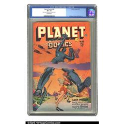 Planet Comics #48 (Fiction House, 1947) CGC VF- 7.5 Off-white pages. What a cover! Everyone runs for their lives as a giant robot tears apart the city, deflecting fighter ships as if they were made of paper. Slight wear across the top edge is the only defect worth mentioning on this gorgeous book. Overstreet 2002 VF 8.0 value = $381. Important notice: We expect to be auctioning lots at the rate of 200-250 per hour. Sometimes eBay Premier live bid software cannot keep up with that pace, so we strongly recommend that you place a realistic proxy bid now as insurance to avoid disappointment. Also please note that all Heritage/CAA lots purchased through eBay Premier carry a 20% Buyer's Premium. Please make sure you read the Terms and Conditions.