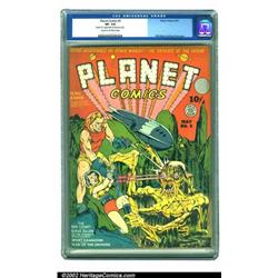 Planet Comics #5 (Fiction House, 1940) CGC VF- 7.5 Cream to off-white pages. On this Eisner/Fine cover, Flint and his girlfriend crash on some strange swampy planet, only to discover horrific three-armed beasts that seem to have a voracious appetite for human flesh. Exhibiting a dust shadow and wear across the top edge, this scarce book has a sharp look to it. Overstreet 2002 VF 8.0 value = $1,534. Important notice: We expect to be auctioning lots at the rate of 200-250 per hour. Sometimes eBay Premier live bid software cannot keep up with that pace, so we strongly recommend that you place a realistic proxy bid now as insurance to avoid disappointment. Also please note that all Heritage/CAA lots purchased through eBay Premier carry a 20% Buyer's Premium. Please make sure you read the Terms and Conditions.