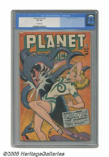 <B>Planet Comics #52 (Fiction House, 1948) CGC VF 8.0 Off-white pages.</B></I> Here's another great Fiction House cover, with an attractive gal front and center. Interior artists for this issue include George Evans and Maurice Whitman; Matt Baker's run would begin in the next issue. This issue has a noticeable bindery chip off the top left corner, but is otherwise virtually flawless. This could be a good deal for the collector who appreciates really nice comics and can live with one minor defect. Overstreet 2005 VF 8.0 value = $388. CGC census 3/05: 1 in 8.0, 7 higher.