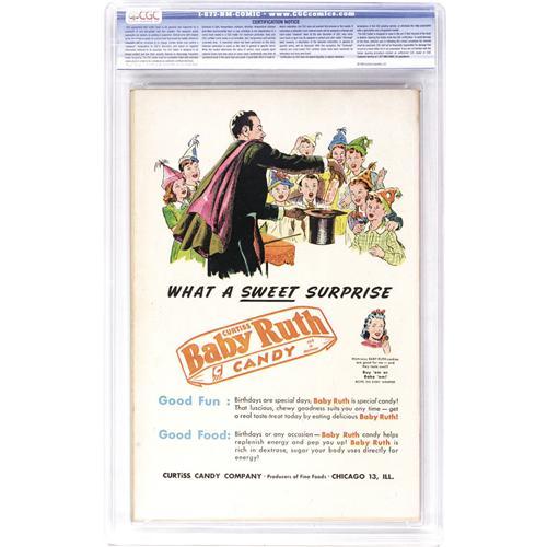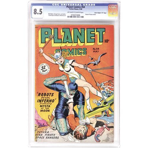 <B>Planet Comics #54 Davis Crippen ("D" Copy) pedigree (Fiction House, 1948) CGC VF+ 8.5 Off-white to white pages.</B></I> Matt Baker contributed art to this issue, as did George Evans and Joe Doolin. There's also a retelling of the origin of secretary-turned Venusian heroine Futura. Overstreet 2006 VF 8.0 value = $388; VF/NM 9.0 value = $612. CGC census 6/06: 3 in 8.5, 2 higher. <I>From the Crippen Collection.</B></I> <BR><BR><B>Important notice:</B> Heritage usually auctions material at the rate of 200-250 lots per hour. On some occasions eBay Live bid software or the Internet may not be able to keep up with the pace of the auction. We recommend placing a realistic absentee bid now as insurance to avoid disappointment. Occasionally the auctioneer may eliminate or reject an eBay Live bid, and the auctioneer may also reopen a lot after the close of the eBay live bidding (usually because we missed an audience bid), and may reject your bid even if it shows you as the winning bidder. By bidding via eBay Live, you agree that Heritage may award the lot to another bidder at its sole discretion under the circumstances described above or any other reasonable circumstances. Since eBay bids are not shown to us until we open the lot on the floor, we treat those bids just like floor bids. In most cases the floor responds before the eBay bid is presented to us, due to Internet lag time, so for consistency we have made it a policy that floor bids are always considered first over tie eBay live bids. Also please note that all Heritage lots purchased through eBay Live carry a 22.5% Buyer's Premium. Please make sure you read the Terms and Conditions before you bid. This lot is being auctioned in conjunction with a live floor auction by Heritage Auction Galleries. All final auction and invoice information will be supplied by Heritage Auction Galleries, and all other information should be considered preliminary. Lot:41001 <BR><BR><B>Winning Notification and Billing:</B> After the FINAL session in this auction is complete, Heritage will send e-mail and snail mail invoices. This process normally takes several days. All final auction and invoice information will be supplied by Heritage Auction Galleries, and all other information should be considered preliminary. <BR><BR>This auction will be conducted on a live auction floor and over the Internet through eBay Live. If you choose to place an absentee bid, please take a moment to <font color='#0000ff'><u><a href='http://pages.ebay.com/liveauctions/help/before/laabsentee.html'>learn how eBay Live absentee bidding works</a></u></font><font color='#000000'>