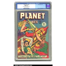 Planet Comics #58 (Fiction House, 1949) CGC FN/VF 7.0 Cream to off-white pages. Hunt Bowman and his woman take the hordes downtown on this classy blue Doolin cover. This copy exhibits some light foxing and a written price on the back cover, along with a tiny corner crease and minor spine wear. Overstreet 2002 FN 6.0 value = $182; VF 8.0 value = $381. Important notice: We expect to be auctioning lots at the rate of 200-250 per hour. Sometimes eBay Premier live bid software cannot keep up with that pace, so we strongly recommend that you place a realistic proxy bid now as insurance to avoid disappointment. Also please note that all Heritage/CAA lots purchased through eBay Premier carry a 20% Buyer's Premium. Please make sure you read the Terms and Conditions.