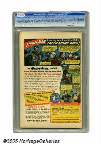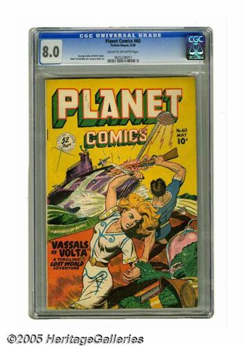 <B>Planet Comics #60 (Fiction House, 1949) CGC VF 8.0 Cream to off-white pages.</B></I> Even after nearly five years of creating all but three of this title's covers (Lily Renee did those three), Joe Doolin was showing no signs of running out of new ideas to combine space action, aliens, distractingly comely lasses, and gorgeous colors. Future EC contributors George Evans and Graham Ingels are among this issue's interior artists. Overstreet 2005 VF 8.0 value = $388. CGC census 3/05: 2 in 8.0, 6 higher.