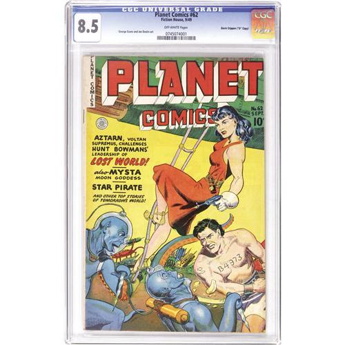 <B>Planet Comics #62 Davis Crippen ("D" Copy) pedigree (Fiction House, 1949) CGC VF+ 8.5 Off-white pages.</B></I> "Aztran, Voltan Supremus," could only be a villain, and this fantastic cover could only come from Fiction House! George Evans and Joe Doolin contributed interior art to the issue. Overstreet 2006 VF 8.0 value = $293; VF/NM 9.0 value = $459. CGC census 6/06: 2 in 8.5, 2 higher. <I>From the Crippen Collection.</B></I> <BR><BR><B>Important notice:</B> Heritage usually auctions material at the rate of 200-250 lots per hour. On some occasions eBay Live bid software or the Internet may not be able to keep up with the pace of the auction. We recommend placing a realistic absentee bid now as insurance to avoid disappointment. Occasionally the auctioneer may eliminate or reject an eBay Live bid, and the auctioneer may also reopen a lot after the close of the eBay live bidding (usually because we missed an audience bid), and may reject your bid even if it shows you as the winning bidder. By bidding via eBay Live, you agree that Heritage may award the lot to another bidder at its sole discretion under the circumstances described above or any other reasonable circumstances. Since eBay bids are not shown to us until we open the lot on the floor, we treat those bids just like floor bids. In most cases the floor responds before the eBay bid is presented to us, due to Internet lag time, so for consistency we have made it a policy that floor bids are always considered first over tie eBay live bids. Also please note that all Heritage lots purchased through eBay Live carry a 22.5% Buyer's Premium. Please make sure you read the Terms and Conditions before you bid. This lot is being auctioned in conjunction with a live floor auction by Heritage Auction Galleries. All final auction and invoice information will be supplied by Heritage Auction Galleries, and all other information should be considered preliminary. Lot:41001 <BR><BR><B>Winning Notification and Billing:</B> After the FINAL session in this auction is complete, Heritage will send e-mail and snail mail invoices. This process normally takes several days. All final auction and invoice information will be supplied by Heritage Auction Galleries, and all other information should be considered preliminary. <BR><BR>This auction will be conducted on a live auction floor and over the Internet through eBay Live. If you choose to place an absentee bid, please take a moment to <font color='#0000ff'><u><a href='http://pages.ebay.com/liveauctions/help/before/laabsentee.html'>learn how eBay Live absentee bidding works</a></u></font><font color='#000000'>
