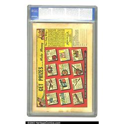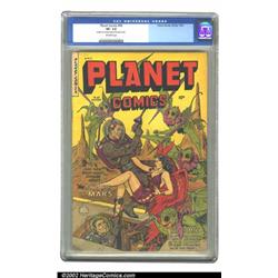 Planet Comics #69 (Fiction House, 1952) CGC VF- 7.5 Off-white pages. Can their brain-waves conquer space? Find out in this yarn entitled "The Mentalists of Mars" featuring a wild yellow cover that would give anybody nightmares. This issue was also used in Parade of Pleasure. The back cover exhibits light foxing and some indentations along the top edge. Overstreet 2002 VF 8.0 value = $286. Important notice: We expect to be auctioning lots at the rate of 200-250 per hour. Sometimes eBay Premier live bid software cannot keep up with that pace, so we strongly recommend that you place a realistic proxy bid now as insurance to avoid disappointment. Also please note that all Heritage/CAA lots purchased through eBay Premier carry a 20% Buyer's Premium. Please make sure you read the Terms and Conditions.