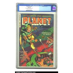 Planet Comics #71 (Fiction House, 1953) CGC VG 4.0 Cream to off-white pages. "Dig Doom Beneath the Red World's Crust in Sandhogs of Mars." Back cover soiling, spine wear and a light crease through the top of the book lands this colorful copy in the VG range. Overstreet 2002 GD 2.0 value = $39; FN 6.0 value = $117. Important notice: We expect to be auctioning lots at the rate of 200-250 per hour. Sometimes eBay Premier live bid software cannot keep up with that pace, so we strongly recommend that you place a realistic proxy bid now as insurance to avoid disappointment. Also please note that all Heritage/CAA lots purchased through eBay Premier carry a 20% Buyer's Premium. Please make sure you read the Terms and Conditions.