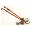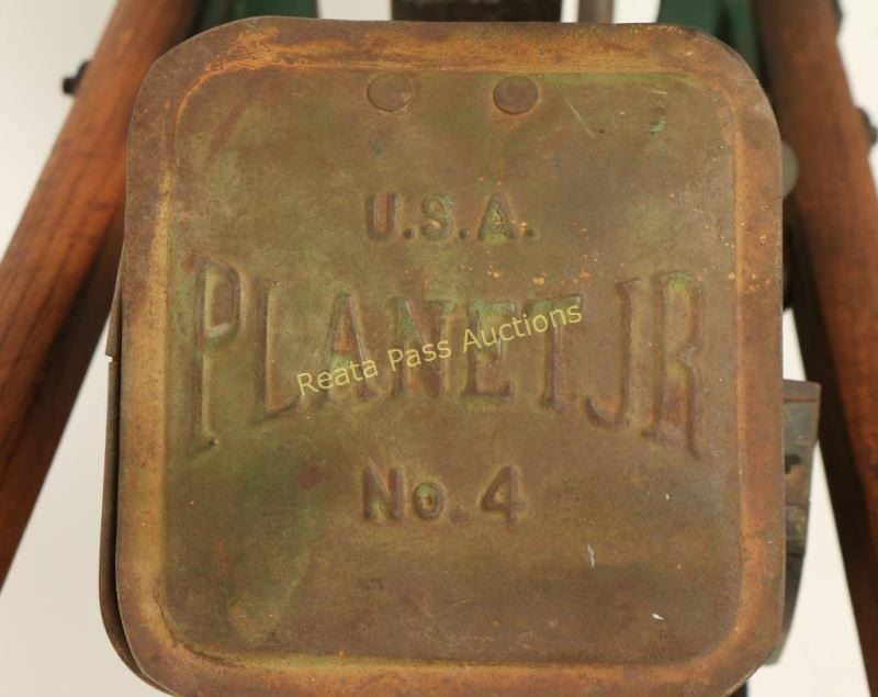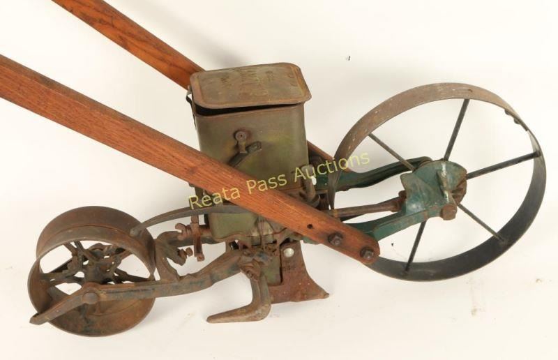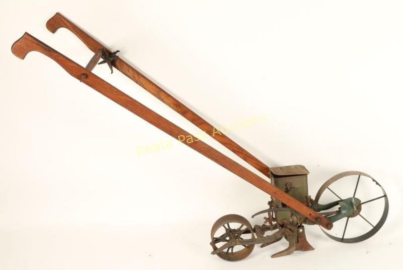 All metal construction with wooden handles. Green seed box still retains some green paint and a faded logo on the front. Reads "U.S.A. Planet Jr, No. 4" Shows rust and age. The Planet Jr Cultivator Line is a Philadelphia maker of one-horse farming tools. It demonstrated the innate brilliance of Jonathan Robinson and other mid-century creators of tools helpful to farmers. Beginning in the late 1870s, the firm has focused on the recreational gardeners as well as one-horse farmers, thriving as suburbanization gathered force, but ensued later by serving a large group of farmers. For the better part of its history, the Planet Jr Cultivator firm highlighted its push wheel hoes and automatic seed drills, devices set with all sort of gadgets and practically hard to describe at that time. During then, wheel hoes turn up with one wheel or two: single wheel gear normally ran between rows of foliage and cut off or ripped up weeds on either side.