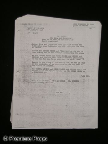 For fans of the Planet of the Apes series, this is a rare treat. This is an original, early version 'Planet of the Apes' (1968) script from Rod Serling that features different characters and an overall very different feel to the film. The character Taylor, played by Charlton Heston in the released film, is named Thomas in this version, with other peripheral characters, such as 'Lefever' and 'Digby,' omitted completely. The ending is also different, as Rod Serling didn't come up with the shocker finale until just before production. Some of the pages say Rev. 1/6/65 and others have 2/2/65 printed on them, making this one of the earliest examples of the film's script. The script is unpunched and double-sided. (measures approx. 8 1/2"x 11")