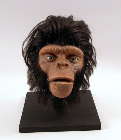 Planet Of The Apes Original Ape Prosthetic - From the award winning make-up department that created the iconic apes for the original "Planet Of The Ape" classic motion pictures Production made chimpanzee head from the original Planet of the Apes movie series (1968-1973), this is a production made Ape foam prosthetic mounted on a lifecast display with added human hair and eyes. (approx. 14" tall)