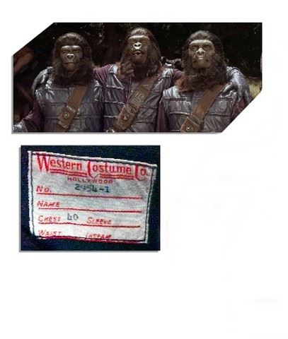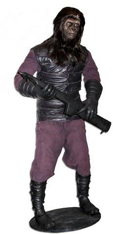From the classic Planet Of The Apes (1968) is a life size screen worn full Ape costume with complete wardrobe and rifle. Western Costume wardrobe tag included. Boots and Gloves are replicas from the original production patterns and rifle is from an original production mold.