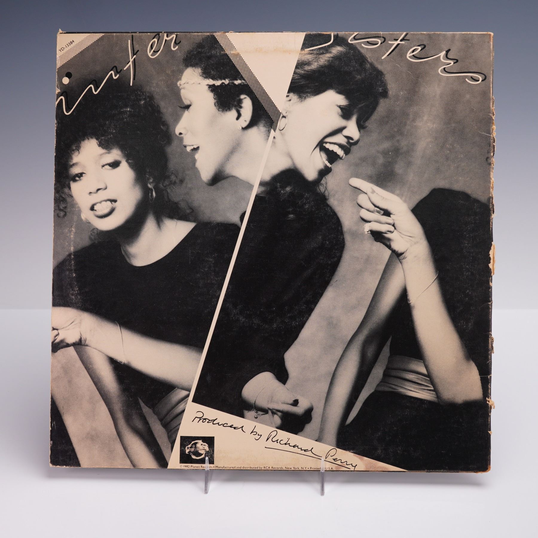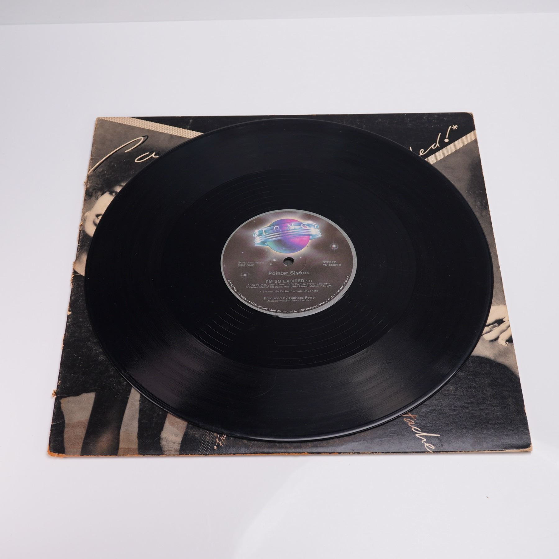 A 1982 U.S. 12-inch maxi single vinyl pressing of the Pointer Sisters' energetic hit "I'm So Excited," backed with "Nothin' But A Heartache," released by Planet Records. The cover design features dynamic black and white portraits of the group members, arranged in an angular, collage like layout that captures the visual flair of the early 1980s. The reverse continues the stylish motif, with photography credit to Norman Seeff and production by Richard Perry prominently noted. The record is pressed on Planet's colorful logo label.