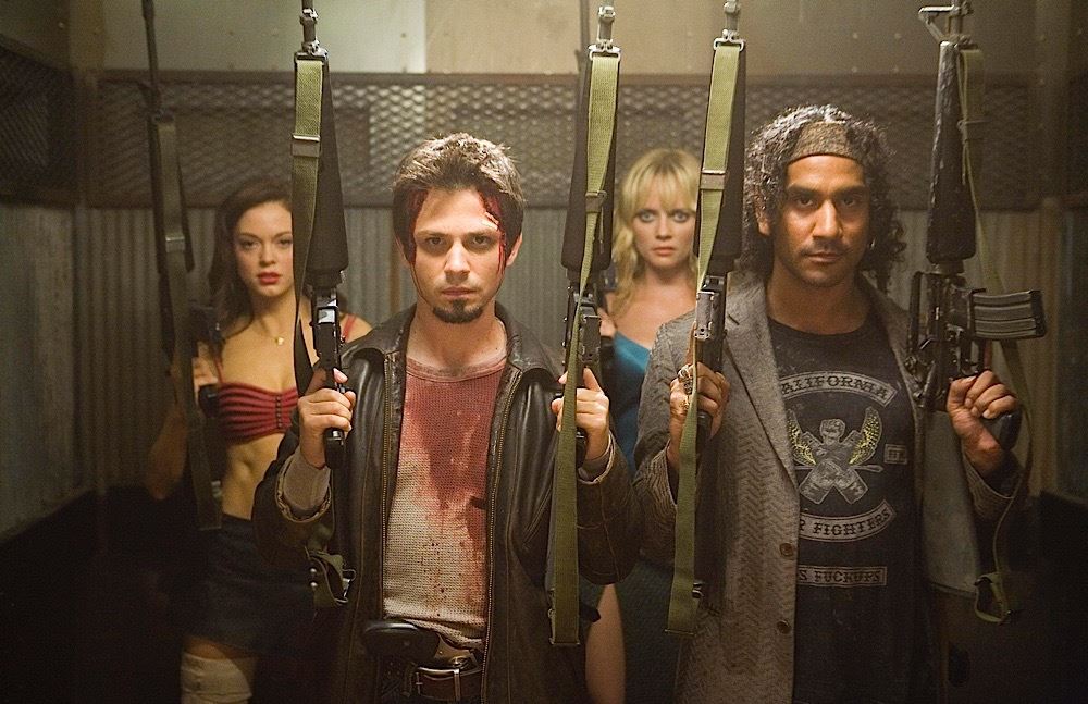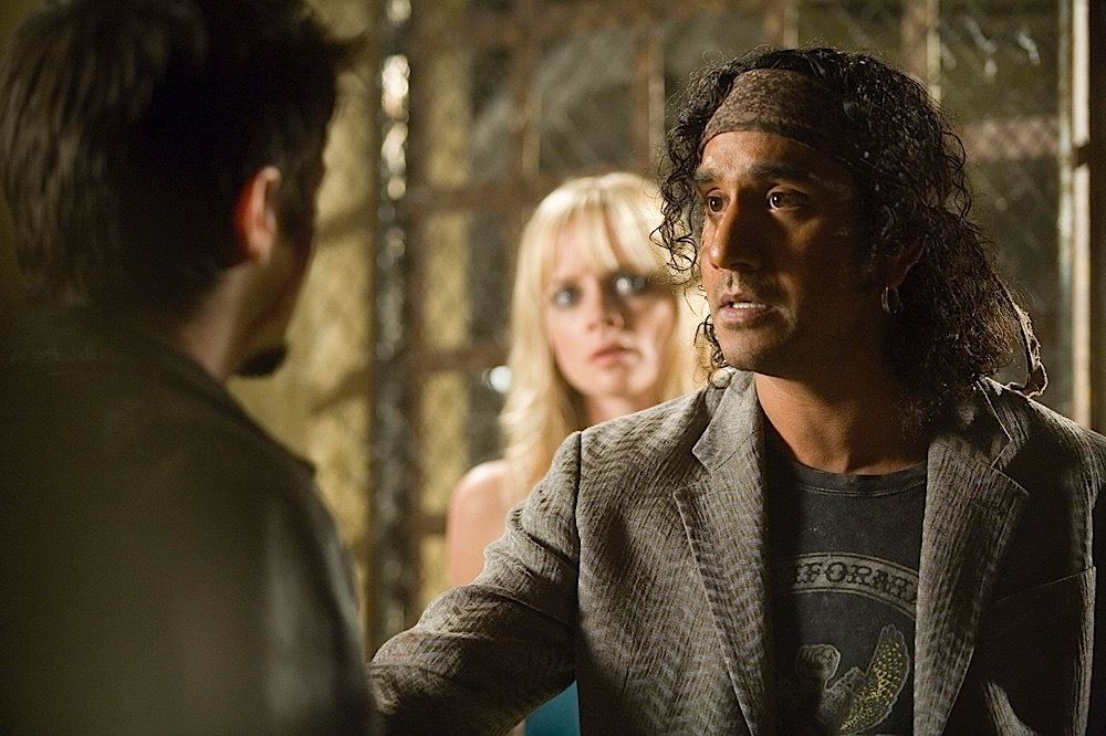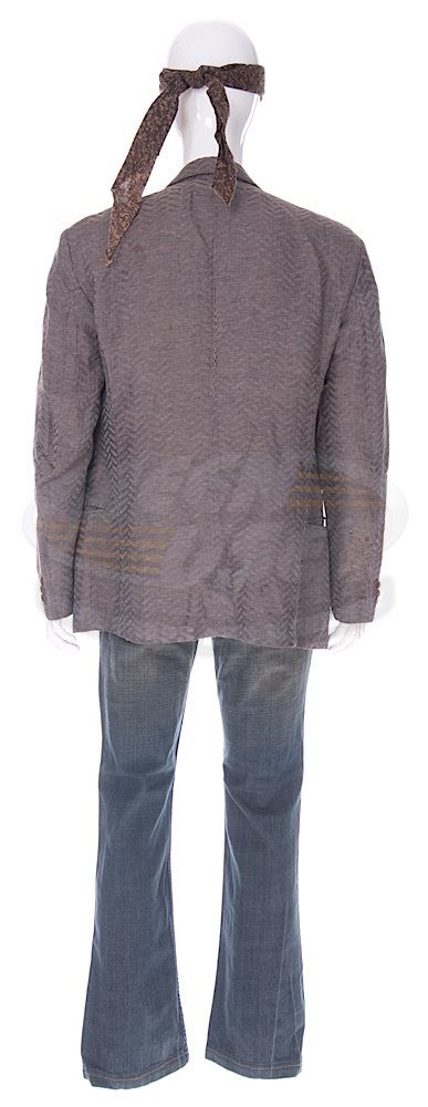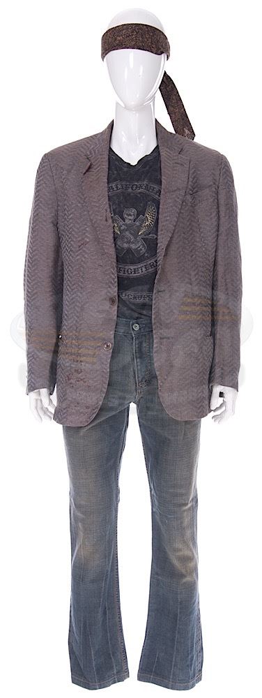 (Dimension Films, 2007) This outfit was acquired by the production for use by Jimmy Roberts as "Abby", Naveen Andrews' stunt double. The outfit consists of a size 42L Armani jacket with some studio blood staining, a faded black California Beer Fighters t-shirt made by Topless, a pair of dark denim jeans made by Antik Denim and a headband made of camouflage material with frayed edges. The jacket and pants are both marked "Stunt" on the inside. Wear from use is present.