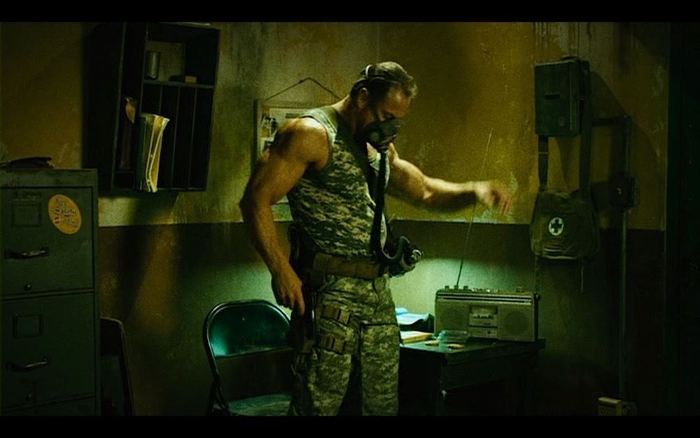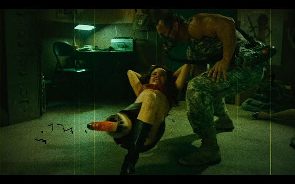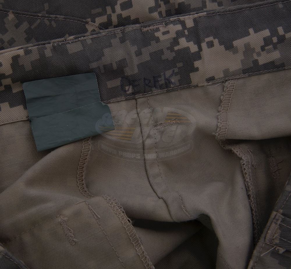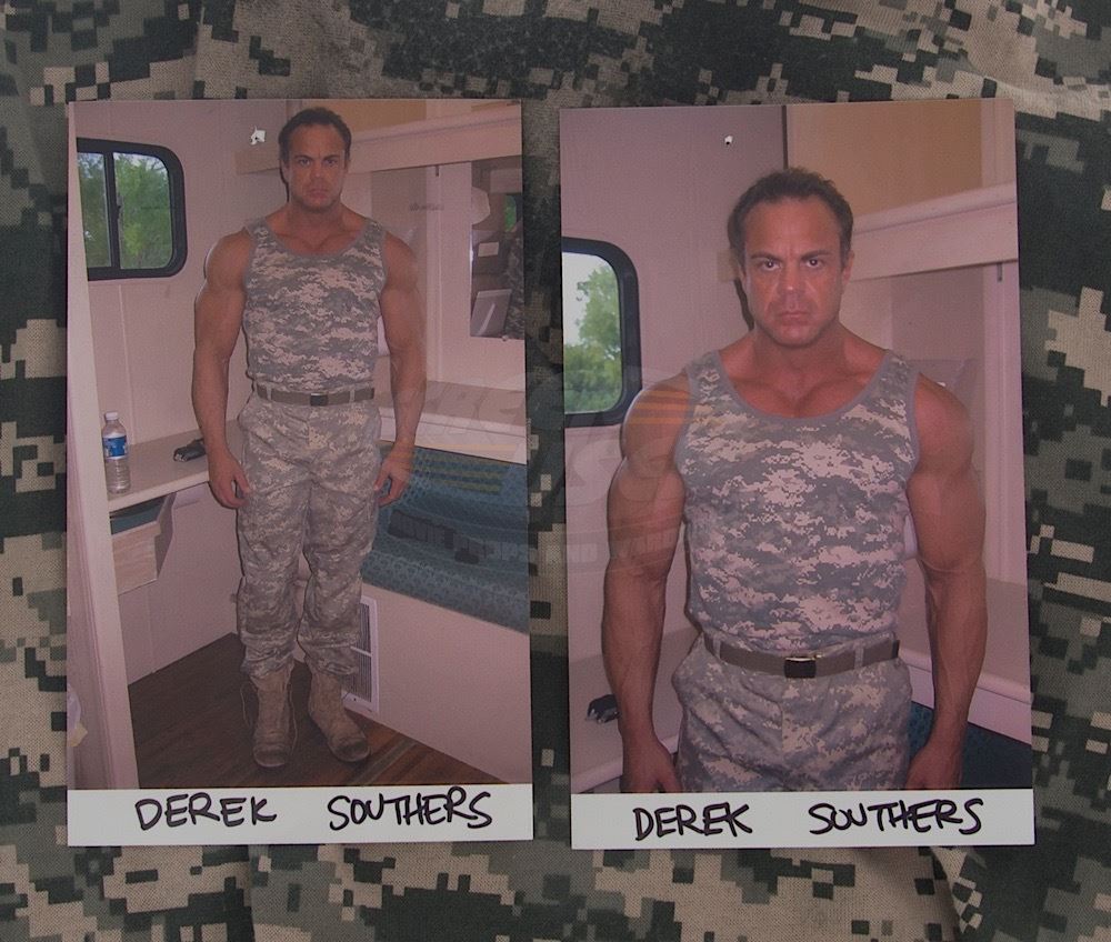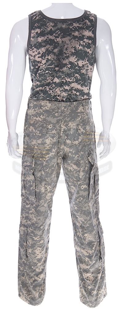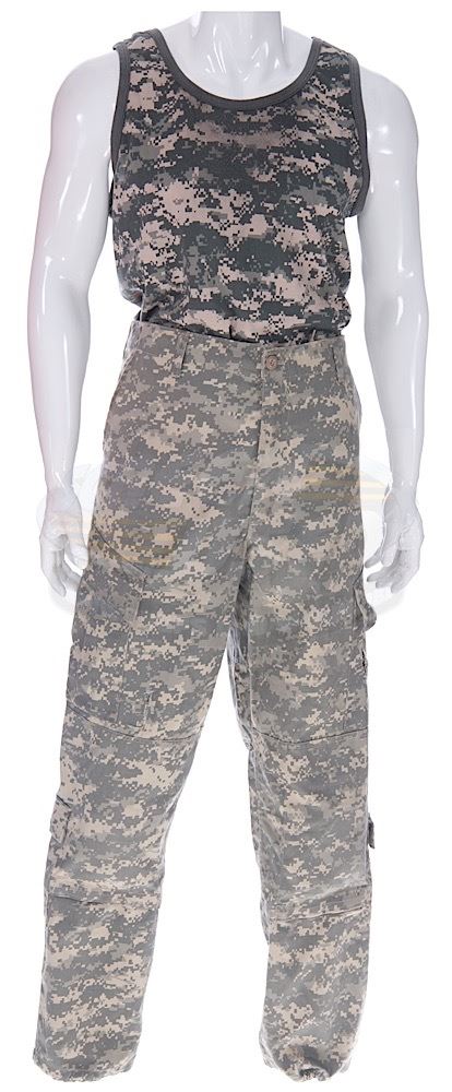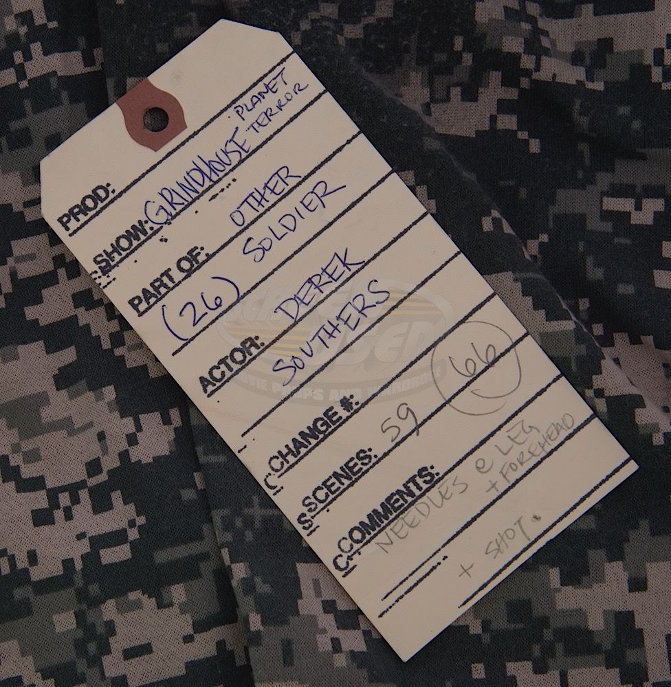 (Dimension Films, 2007) This military uniform was acquired by the production for use by Derek Southers as "Soldier #2". The costume consists of a tank top and a pair of pants, both featuring a camouflage pattern. The pants have "Derek" written on the inside. Wear and distressing is present from use. Included with the costume is a production used costume tag that details the film, actor and scene number used and two 4" x 6" color set photos of actor "Derek Southers" in costume.