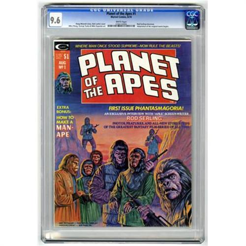 <B>Planet of the Apes #1 (Marvel, 1974) CGC NM+ 9.6 White pages.</B></I> Adaptation of the original movie begins. Rod Serling interview. Bob Larkin cover. Mike Ploog and George Tuska art. Overstreet 2007 NM- 9.2 value = $40. CGC census 10/07: 17 in 9.6, 42 higher.<BR><BR><b>Shipping:</b> Comics - Slabbed (certified) (<a target="_blank" href="http://www.heritageauctions.com/common/shipping.php">view shipping information</a>)