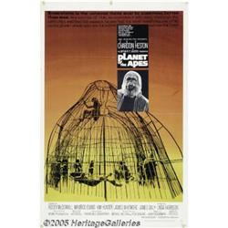<B>Planet of the Apes (20th Century Fox, 1968)</B></I> One Sheet (27" X 41"). Franklin J. Schaffner's adaptation of Pierre Boulle's novel is nothing short of one of the greatest science fiction flms ever made. Charlton Heston stars as an astronaut thrown so far into the future he lands on a world where evolution has made apes the master and man the animal. The ending has been declared the greatest surprise ending for any film, and that's probably due to the script by Rod Serling, the original creator of The Twilight Zone. The interior of this one sheet is extremely clean with tack-holes and tape residue in the borders. Fine/Very Fine.