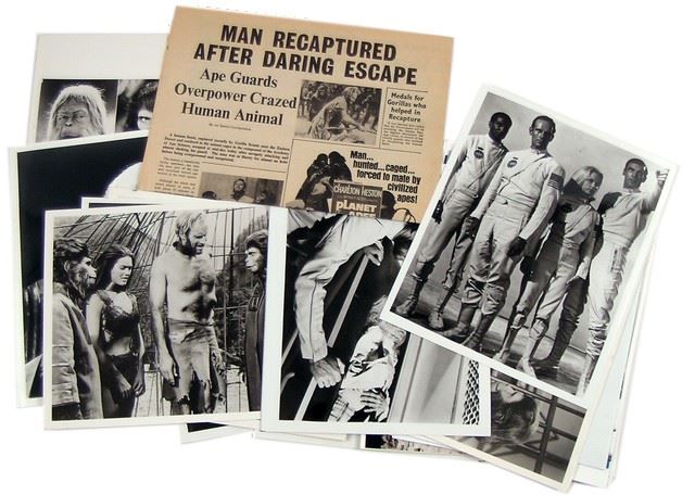 Planet of the Apes (1968) press kit 8" x 10"s and newspaper. "Get your stinking paws" onto this rare press kit from the original Planet of the Apes starring Charleton Heston as Taylor, an astronaut who crash lands on a world dominated by highly intelligent apes. Written by The Twilight Zone's Rod Serling, this is the film that set the standard for all "ape" movies to follow.