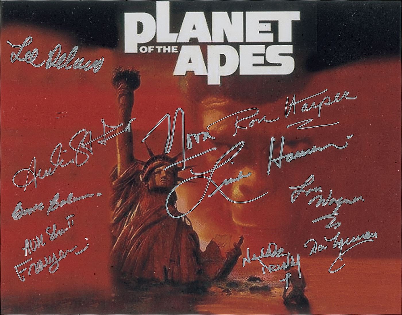 Color glossy 14 x 11 photo of a poster for the 1968 film Planet of the Apes, signed in silver ink by several cast members from the film and its ensuing sequels and television series, including: Linda Harrison (who adds “Nova”), Lou Wagner, Ron Harper, Don Murray, Lee Delano, Austin Stoker, Booth Colman, Natalie Trundy, and Gary Dubin. In fine condition, with a slightly grainy image quality.