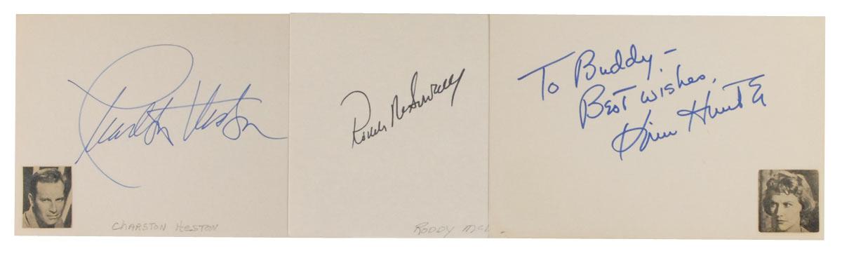 Felt tip signatures of Charlton Heston, Roddy McDowell, and Kim Hunter (ins) on individual off-white 6 x 4 cards. In fine condition, with some mild toning to cards.