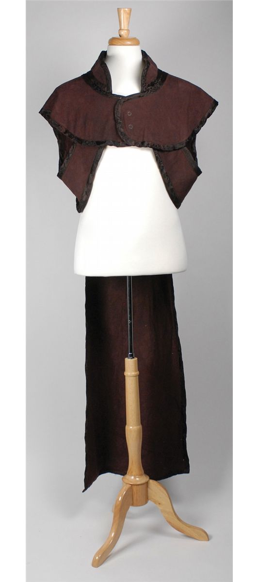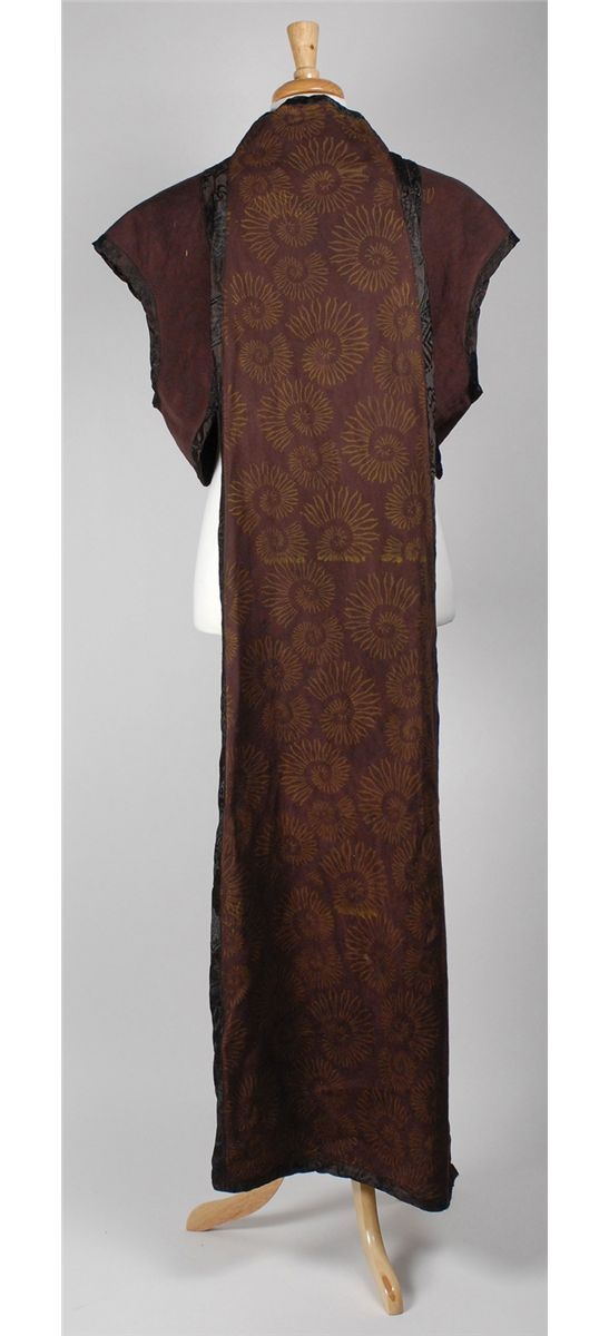 Ape robe from the 2001 remake of Planet of the Apes. Full-length maroon sleeveless robe has four snaps at the top and is highlighted with floral material around the edges, and a spiral gold design on the back. In fine condition. Accompanied by a certificate of authenticity from 20th Century Fox.