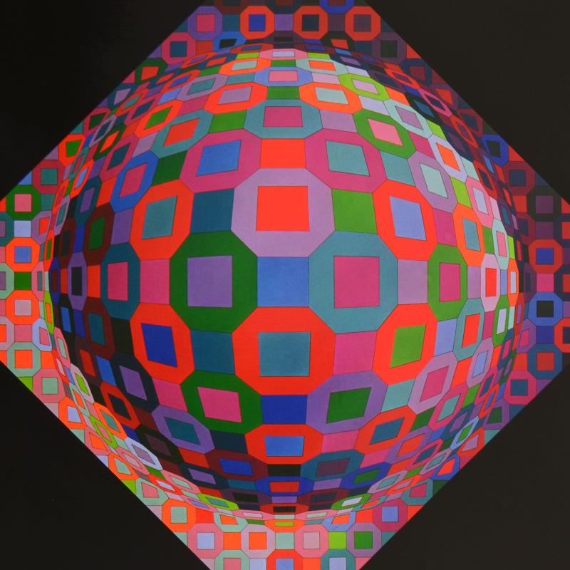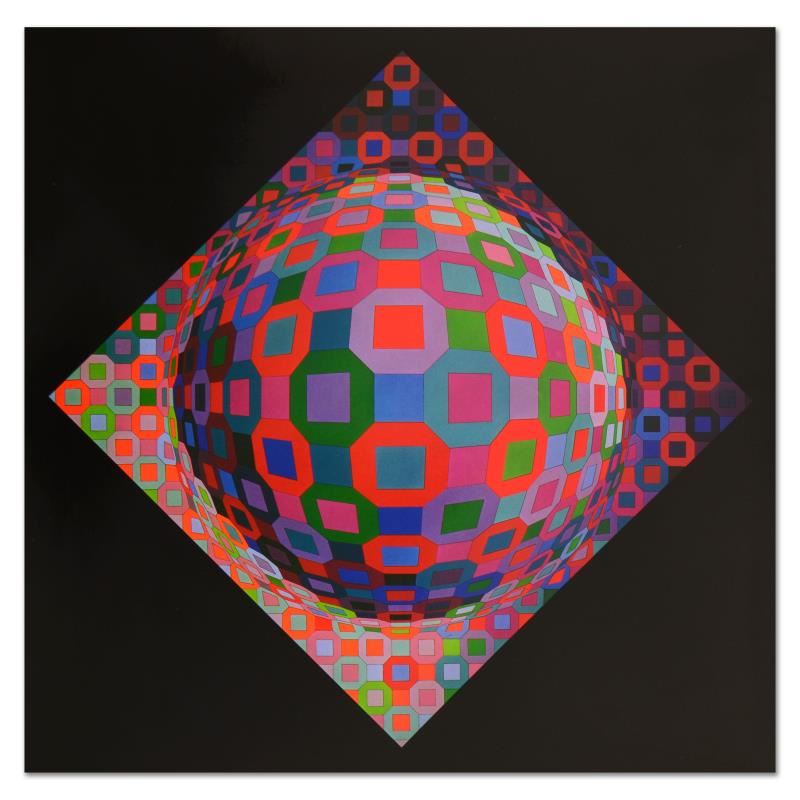 "Planetary" is a heliogravure print on paper from the Editions du Griffon (1974) by Victor Vasarely (1908-1997). This piece is titled inverso. Measures approx. 23.5" x 23.5" (image).