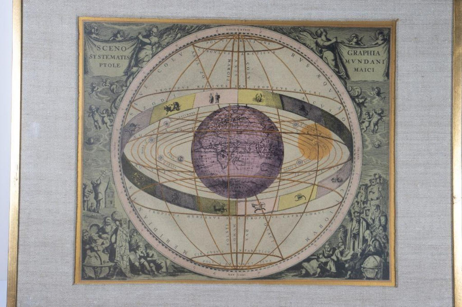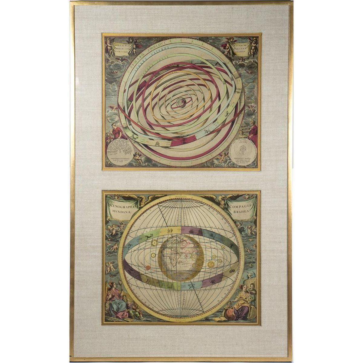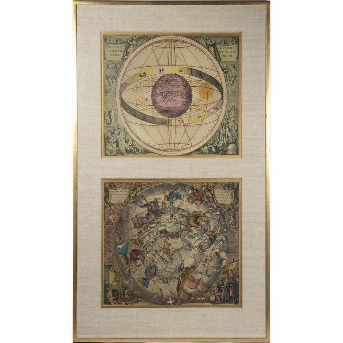 Four of the series; (Briefly) Sceno Systematis Ptole; Haemisphaere graphicumgraphia Mundanae; Orbium Platerram; Scenographia Mundanae. Each map plate 18in. X 15in. Framed 25in.X 41in. (two frames, 2 maps per frame). Condition very good; colors bright; appear trimmed (?). NOTE: The maps are custom-framed by Atherton Gallery; they have not been opened/examined, date unknown.