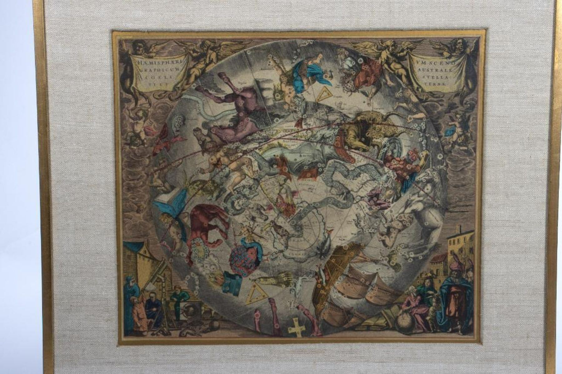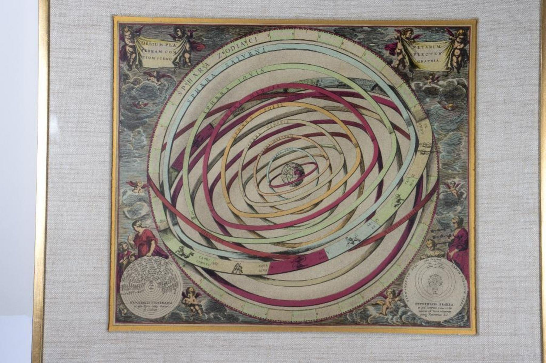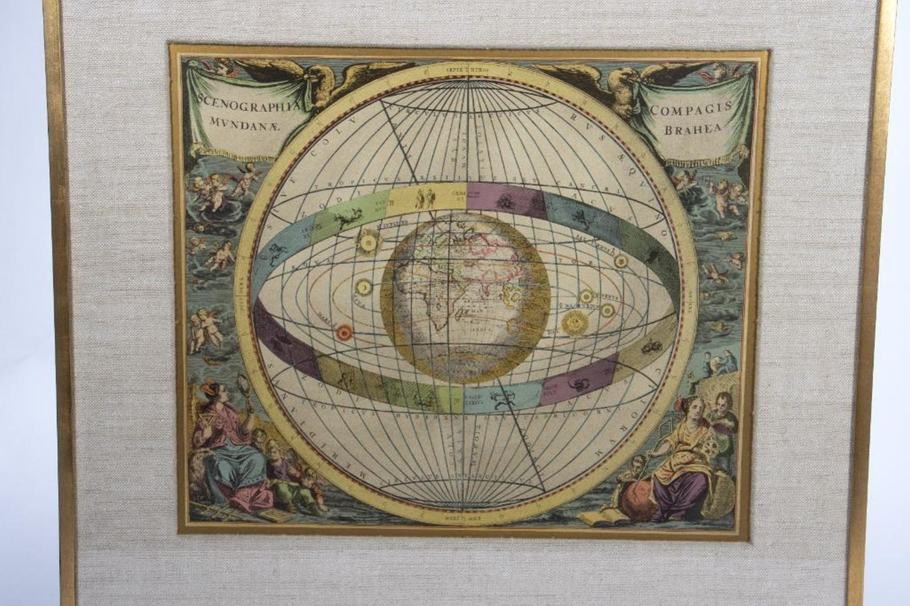 Four of the series; (Briefly) Sceno Systematis Ptole; Haemisphaere graphicumgraphia Mundanae; Orbium Platerram; Scenographia Mundanae. Each map plate 18in. X 15in. Framed 25in.X 41in. (two frames, 2 maps per frame). Condition very good; colors bright; appear trimmed (?). NOTE: The maps are custom-framed by Atherton Gallery; they have not been opened/examined, date unknown.