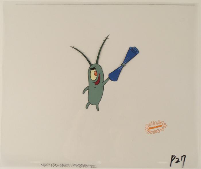 To create production cels, the original animator's drawing is transferred onto an acetate cel (by hand-inking and/or photo copying). The cel is then hand-painted on the reverse side. The cel is ready to be matted and framed. The animator's notations are at the bottom of the cel. There is some slight paint fade to Plankton's outline. There is a Nickelodeon TV logo on the bottom right of the cel.