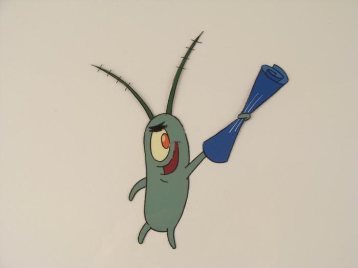 This original animation cel is from the Nickelodeon TV show SpongeBob Squarepants. The story takes place under the deep blue sea in Bikini Bottom, where SpongeBob resides. SpongeBob, who is a yellow, porous sponge, is your typical happy-go-lucky character, as he is always cheerful and enjoys making people laugh. Patrick Star, SpongeBob's neighbor who is a starfish, is your average children's show idiot, as he boasts knowing nothing and is often getting himself into ridiculous situations. Between the homes of these two lies the home of the miserable Squidward, a squid, who is known for being grouchy and playing tricks on SpongeBob and Patrick. Both SpongeBob and Squidward work at the Krusty Krab, a fast food business run by the greedy money-loving Mr. Krabs, a crab, the arch rival of the evil, possibly misunderstood, Plankton. Another neighbor, Sandy Cheeks, an athletic squirrel who normally wears an astronaut's space suit, was introduced in "Tea at the Treedome." She spends most of her time inventing and experimenting. What is Plankton's plan this time?Original Production Animated Cel Overall Size of Cel: 10 1/2" x 12 1/2" Very Good ConditionThis is an original hand-painted cel set-up used in the production of an episode of "SpongeBob SquarePants." Each one-of-a-kind set-up represents a slight change in position of the characters. When individually photographed and projected in rapid succession, the images appear to move.