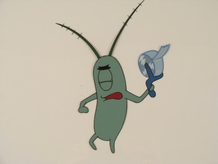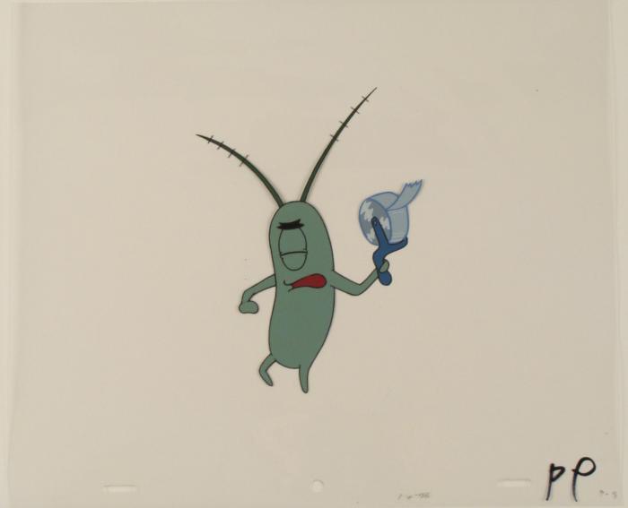 This original animation cel is from the Nickelodeon TV show SpongeBob Squarepants. The story takes place under the deep blue sea in Bikini Bottom, where SpongeBob resides. SpongeBob, who is a yellow, porous sponge, is your typical happy-go-lucky character, as he is always cheerful and enjoys making people laugh. Patrick Star, SpongeBob's neighbor who is a starfish, is your average children's show idiot, as he boasts knowing nothing and is often getting himself into ridiculous situations. Between the homes of these two lies the home of the miserable Squidward, a squid, who is known for being grouchy and playing tricks on SpongeBob and Patrick. Both SpongeBob and Squidward work at the Krusty Krab, a fast food business run by the greedy money-loving Mr. Krabs, a crab, the arch rival of the evil, possibly misunderstood, Plankton. Another neighbor, Sandy Cheeks, an athletic squirrel who normally wears an astronaut's space suit, was introduced in "Tea at the Treedome." She spends most of her time inventing and experimenting. Plankton's eye is closed.Original Production Animated Cel Overall Size of Cel: 10 1/2" x 12 1/2" Very Good ConditionThis is an original hand-painted cel set-up used in the production of an episode of "SpongeBob SquarePants." Each one-of-a-kind set-up represents a slight change in position of the characters. When individually photographed and projected in rapid succession, the images appear to move.
