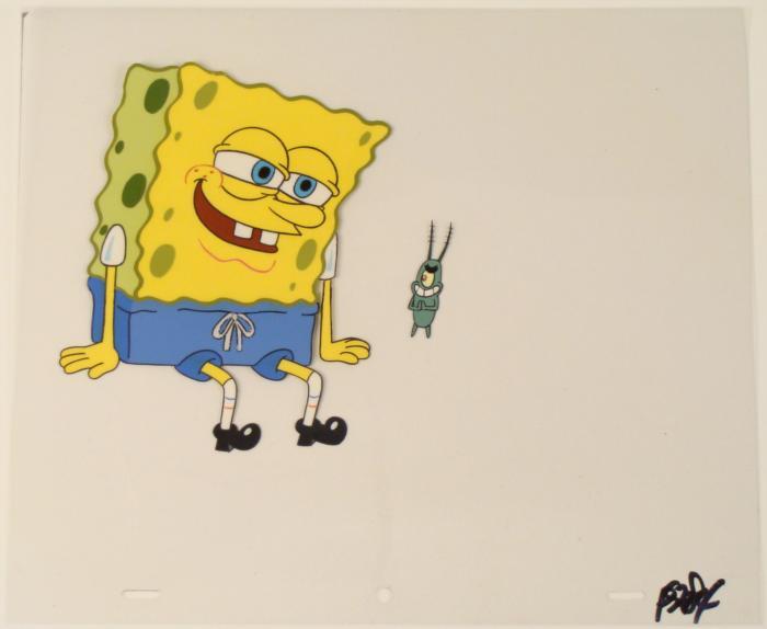 This original animation cel is from the Nickelodeon TV show SpongeBob Squarepants. The story takes place under the deep blue sea in Bikini Bottom, where SpongeBob resides. SpongeBob, who is a yellow, porous sponge, is your typical happy-go-lucky character, as he is always cheerful and enjoys making people laugh. Patrick Star, SpongeBob's neighbor who is a starfish, is your average children's show idiot, as he boasts knowing nothing and is often getting himself into ridiculous situations. Between the homes of these two lies the home of the miserable Squidward, a squid, who is known for being grouchy and playing tricks on SpongeBob and Patrick. Both SpongeBob and Squidward work at the Krusty Krab, a fast food business run by the greedy money-loving Mr. Krabs, a crab, the arch rival of the evil, possibly misunderstood, Plankton. Another neighbor, Sandy Cheeks, an athletic squirrel who normally wears an astronaut's space suit, was introduced in "Tea at the Treedome." She spends most of her time inventing and experimenting. In this cel Plankton is standing with an evil grin, while SpongeBob is smiling a bit too. Original Production Animated Cel Overall Size of Cel: 10 1/2" x 12 1/2" Excellent ConditionThis is an original hand-painted cel set-up used in the production of an episode of "SpongeBob SquarePants." Each one-of-a-kind set-up represents a slight change in position of the characters. When individually photographed and projected in rapid succession, the images appear to move.