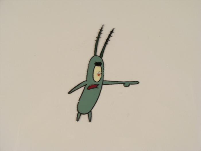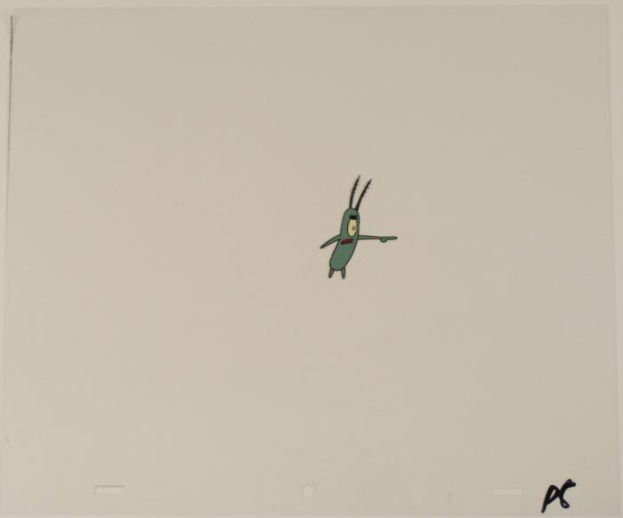 This original animation cel is from the Nickelodeon TV show SpongeBob Squarepants. The story takes place under the deep blue sea in Bikini Bottom, where SpongeBob resides. SpongeBob, who is a yellow, porous sponge, is your typical happy-go-lucky character, as he is always cheerful and enjoys making people laugh. Patrick Star, SpongeBob's Starfish neighbor, boasts knowing nothing and is often getting himself into ridiculous situations. Between the homes of these two lies the home of the miserable Squidward, a squid, who is known for being grouchy and playing tricks on SpongeBob and Patrick. Both SpongeBob and Squidward work at the Krusty Krab, a fast food business run by the greedy money-loving Mr. Krabs, a crab, the arch rival of the evil, possibly misunderstood, Plankton. Another neighbor, Sandy Cheeks, an athletic squirrel who normally wears an astronaut's space suit, was introduced in "Tea at the Treedome." She spends most of her time inventing and experimenting. In this cel a perturbed Plankton is talking pointing into the distance, from a scene that included SpongeBob. Original Production Animated Cel Overall Size of Cel: 10 1/2" x 12 1/2" Excellent Condition; minor outline wearThis is an original hand-painted cel set-up used in the production of an episode of "SpongeBob SquarePants." Each one-of-a-kind set-up represents a slight change in position of the characters. When individually photographed and projected in rapid succession, the images appear to move.