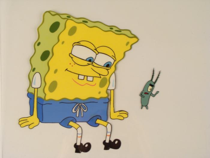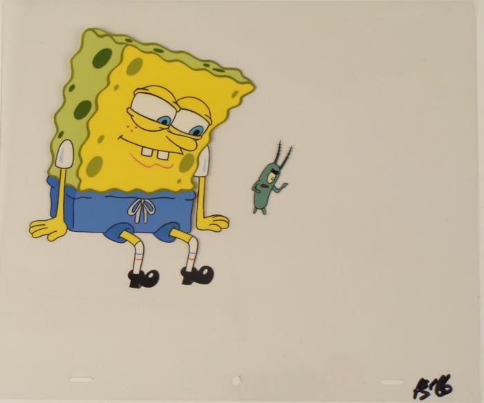 This original animation cel is from the Nickelodeon TV show SpongeBob Squarepants. The story takes place under the deep blue sea in Bikini Bottom, where SpongeBob resides. SpongeBob, who is a yellow, porous sponge, is your typical happy-go-lucky character, as he is always cheerful and enjoys making people laugh. Patrick Star, SpongeBob's neighbor who is a starfish, is your average children's show idiot, as he boasts knowing nothing and is often getting himself into ridiculous situations. Between the homes of these two lies the home of the miserable Squidward, a squid, who is known for being grouchy and playing tricks on SpongeBob and Patrick. Both SpongeBob and Squidward work at the Krusty Krab, a fast food business run by the greedy money-loving Mr. Krabs, a crab, the arch rival of the evil, possibly misunderstood, Plankton. Another neighbor, Sandy Cheeks, an athletic squirrel who normally wears an astronaut's space suit, was introduced in "Tea at the Treedome." She spends most of her time inventing and experimenting. In this cel Plankton is to something, while SpongeBob watches him. Original Production Animated Cel Overall Size of Cel: 10 1/2" x 12 1/2" Excellent ConditionThis is an original hand-painted cel set-up used in the production of an episode of "SpongeBob SquarePants." Each one-of-a-kind set-up represents a slight change in position of the characters. When individually photographed and projected in rapid succession, the images appear to move.