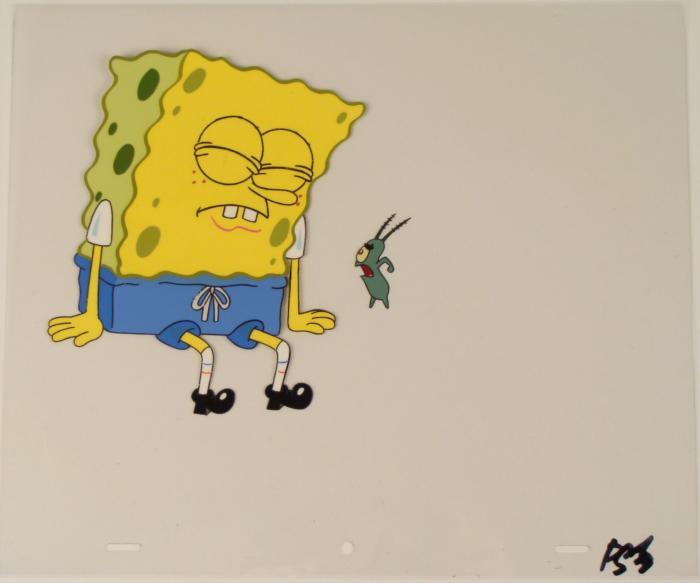 This original animation cel is from the Nickelodeon TV show SpongeBob Squarepants. The story takes place under the deep blue sea in Bikini Bottom, where SpongeBob resides. SpongeBob, who is a yellow, porous sponge, is your typical happy-go-lucky character, as he is always cheerful and enjoys making people laugh. Patrick Star, SpongeBob's neighbor who is a starfish, as he boasts knowing nothing and is often getting himself into ridiculous situations. Between the homes of these two lies the home of the miserable Squidward, a squid, who is known for being grouchy and playing tricks on SpongeBob and Patrick. Both SpongeBob and Squidward work at the Krusty Krab, a fast food business run by the greedy money-loving Mr. Krabs, a crab, the arch rival of the evil, possibly misunderstood, Plankton. Another neighbor, Sandy Cheeks, an athletic squirrel who normally wears an astronaut's space suit, was introduced in "Tea at the Treedome." She spends most of her time inventing and experimenting. In this cel Plankton is shouting at SpongeBob who doesn't want to hear it. Original Production Animated Cel Overall Size of Cel: 10 1/2" x 12 1/2" Excellent Condition; minor outline wearThis is an original hand-painted cel set-up used in the production of an episode of "SpongeBob SquarePants." Each one-of-a-kind set-up represents a slight change in position of the characters. When individually photographed and projected in rapid succession, the images appear to move.
