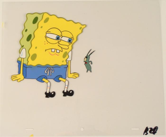 This original animation cel is from the Nickelodeon TV show SpongeBob Squarepants. The story takes place under the deep blue sea in Bikini Bottom, where SpongeBob resides. SpongeBob, who is a yellow, porous sponge, is your typical happy-go-lucky character, as he is always cheerful and enjoys making people laugh. Patrick Star, SpongeBob's neighbor who is a starfish, as he boasts knowing nothing and is often getting himself into ridiculous situations. Between the homes of these two lies the home of the miserable Squidward, a squid, who is known for being grouchy and playing tricks on SpongeBob and Patrick. Both SpongeBob and Squidward work at the Krusty Krab, a fast food business run by the greedy money-loving Mr. Krabs, a crab, the arch rival of the evil, possibly misunderstood, Plankton. Another neighbor, Sandy Cheeks, an athletic squirrel who normally wears an astronaut's space suit, was introduced in "Tea at the Treedome." She spends most of her time inventing and experimenting. In this cel Plankton is yelling something at SpongeBob. Original Production Animated Cel Overall Size of Cel: 10 1/2" x 12 1/2" Excellent ConditionThis is an original hand-painted cel set-up used in the production of an episode of "SpongeBob SquarePants." Each one-of-a-kind set-up represents a slight change in position of the characters. When individually photographed and projected in rapid succession, the images appear to move.