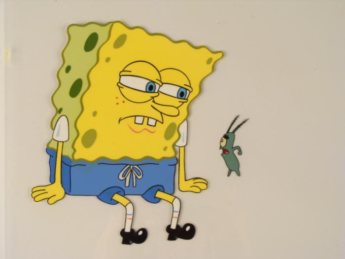 This original animation cel is from the Nickelodeon TV show SpongeBob Squarepants. The story takes place under the deep blue sea in Bikini Bottom, where SpongeBob resides. SpongeBob, who is a yellow, porous sponge, is your typical happy-go-lucky character, as he is always cheerful and enjoys making people laugh. Patrick Star, SpongeBob's neighbor who is a starfish, as he boasts knowing nothing and is often getting himself into ridiculous situations. Between the homes of these two lies the home of the miserable Squidward, a squid, who is known for being grouchy and playing tricks on SpongeBob and Patrick. Both SpongeBob and Squidward work at the Krusty Krab, a fast food business run by the greedy money-loving Mr. Krabs, a crab, the arch rival of the evil, possibly misunderstood, Plankton. Another neighbor, Sandy Cheeks, an athletic squirrel who normally wears an astronaut's space suit, was introduced in "Tea at the Treedome." She spends most of her time inventing and experimenting. In this cel Plankton is yelling something at SpongeBob. Original Production Animated Cel Overall Size of Cel: 10 1/2" x 12 1/2" Excellent ConditionThis is an original hand-painted cel set-up used in the production of an episode of "SpongeBob SquarePants." Each one-of-a-kind set-up represents a slight change in position of the characters. When individually photographed and projected in rapid succession, the images appear to move.