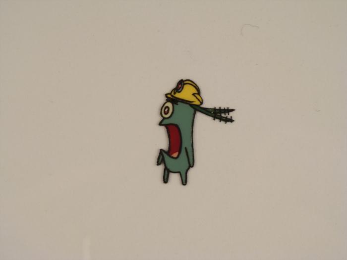 This original animation cel is from the Nickelodeon TV show SpongeBob Squarepants. The story takes place under the deep blue sea in Bikini Bottom, where SpongeBob resides. SpongeBob, who is a yellow, porous sponge, is your typical happy-go-lucky character, as he is always cheerful and enjoys making people laugh. Patrick Star, SpongeBob's neighbor who is a starfish, is your average children's show idiot, as he boasts knowing nothing and is often getting himself into ridiculous situations. Between the homes of these two lies the home of the miserable Squidward, a squid, who is known for being grouchy and playing tricks on SpongeBob and Patrick. Both SpongeBob and Squidward work at the Krusty Krab, a fast food business run by the greedy money-loving Mr. Krabs, a crab, the arch rival of the evil, possibly misunderstood, Plankton. Another neighbor, Sandy Cheeks, an athletic squirrel who normally wears an astronaut's space suit, was introduced in "Tea at the Treedome." She spends most of her time inventing and experimenting. Here, it appears Plankton is in shock to what he's witnessing.Original Production Animated Cel Overall Size of Cel: 10 1/2" x 12 1/2" Excellent ConditionThis is an original hand-painted cel set-up used in the production of an episode of "SpongeBob SquarePants." Each one-of-a-kind set-up represents a slight change in position of the characters. When individually photographed and projected in rapid succession, the images appear to move.