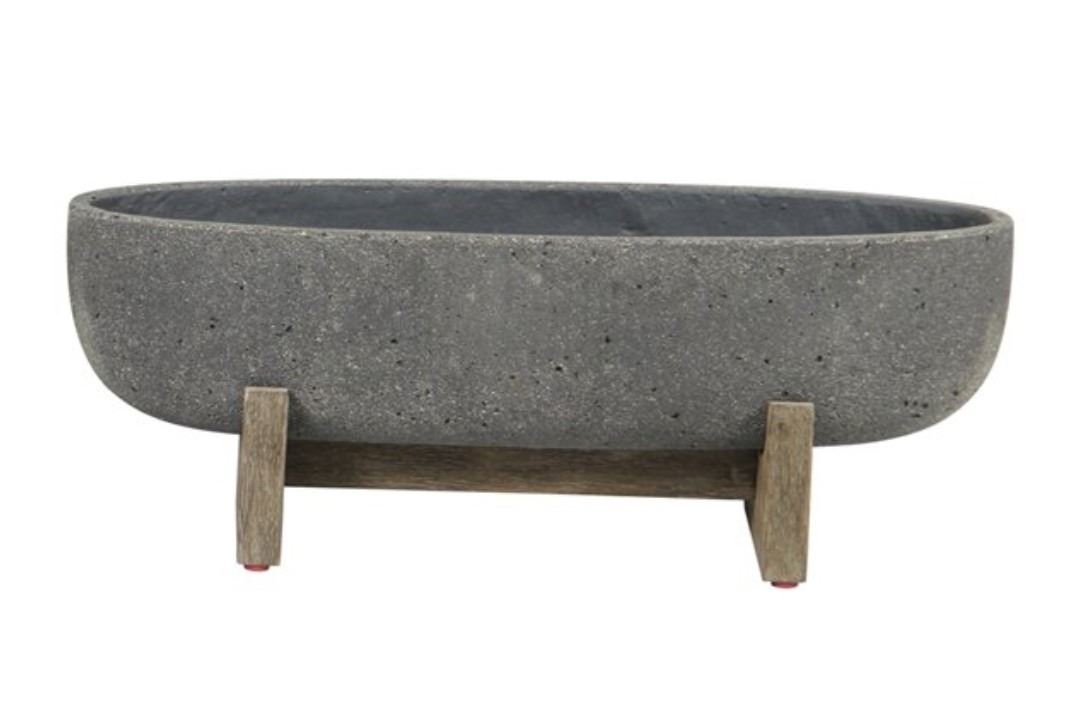 Patio Oval Standing Pot, Grey Stone, Acacia Wood Base, Made Of Ficonstone, Indoor/Outdoor Use, Shelf Pull, Like New Condition