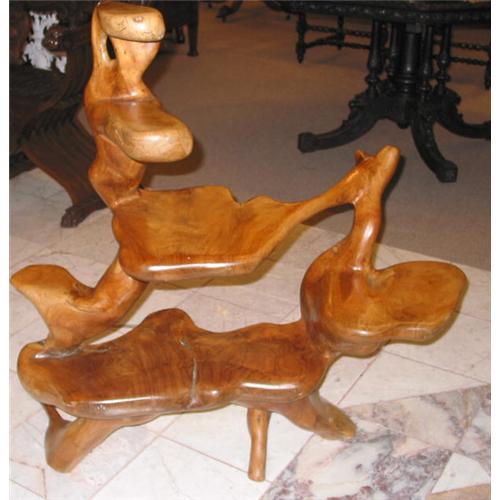 Teak root fern/plant stand from Indonesia. This is a single piece of solid wood with carved display sections. The timber is at least 100yrs old. Dramatic patina. Can be used indoors or outside. The latter would need occasional teak oil treatment to retain the color. If untreated the timber will mellow to a greyish color but will not deteriorate. Great conversation piece.