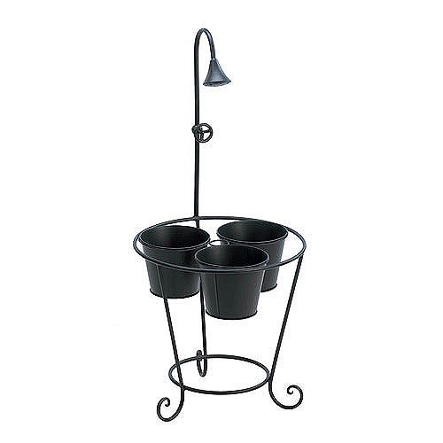Plant Trio Stand With Water Faucet **|**|** Shower three of your favorite potted plants with charm! This black metal plant stand features a decorative shower head and faucet handle. Place three plants inside the containers of this circular stand and watch as your potted garden blooms with appeal. The black metal framework features curled feet and a faux shower head and faucet handle that will add undeniable charm to your yard or patio. Item weight: 2.6 lbs. 15" x 14-5/8" x 31-1/4" high; each pot: 6" diameter x 4-3/4" high. Metal.