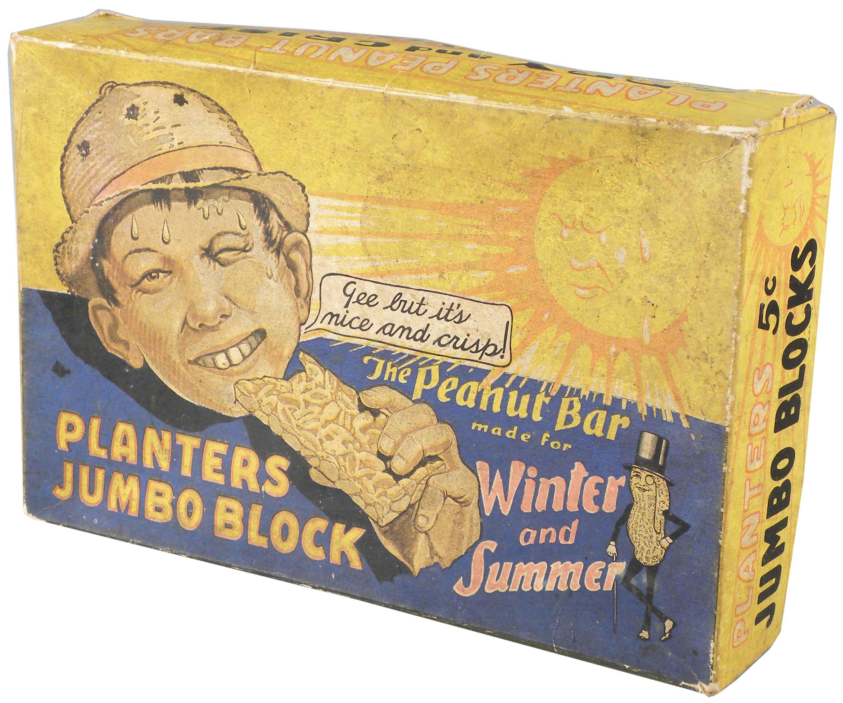 Planters Jumbo Peanut Block Candy Box. The Peanut Bar made for Winter and Summer. 11 X 2 X 7 1/4 inches. Some staining and one lid corner partially torn, fair to good condition.
