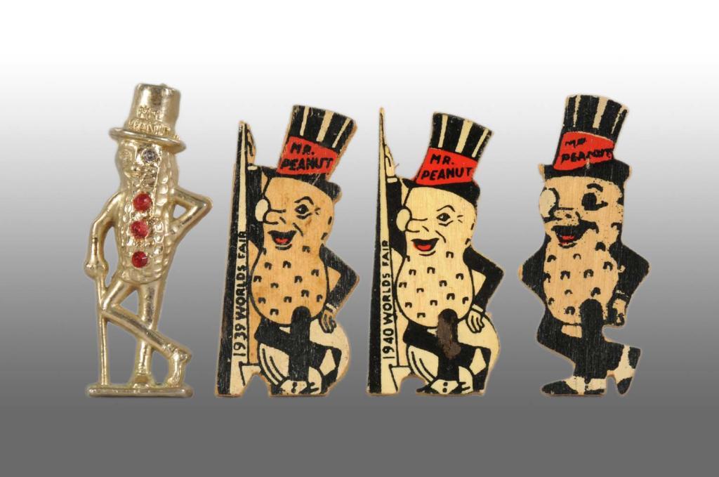 Set includes one metal pin with rhinestones in body, one wooden Mr. Peanut pin, one wooden 1939 New York World’s Fair Mr. Peanut pin and one wooden 1940 New York World’s Fair Mr. Peanut pin. Condition (Near Mint). Size All: 1 - 7/8" x 3/4".