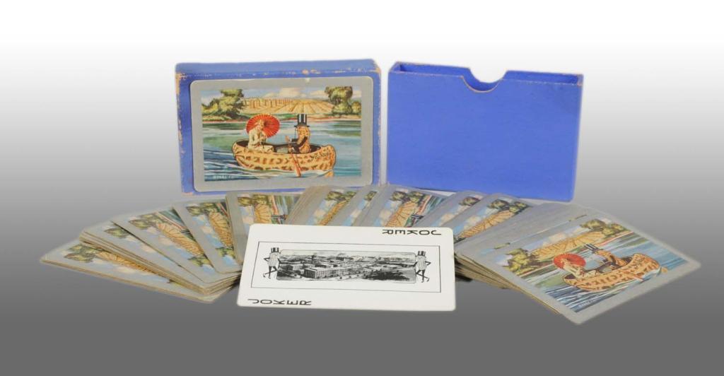1930s. Complete deck of 52 playing cards that includes one original joker, which pictures the Planters factory, and original blue box marked “Planters Products” but no instruction card. Cards have been used; however, silver edges and color graphics are still strong. Condition (Excellent). Size 4" x 2 - 1/2" x 7/8".