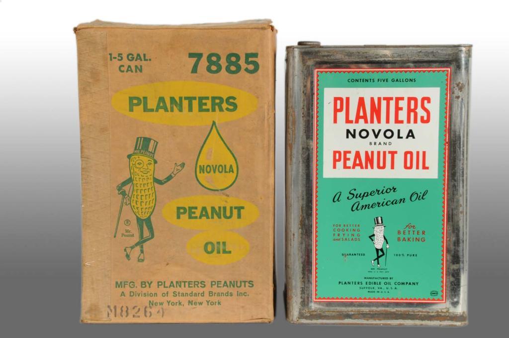 1940s. Five-gallon square tin with graphics on all four side panels and minor overall wear. Includes original box. Condition (Excellent). Size 14 - 1/4" x 9 - 3/8" x 9 - 3/8".