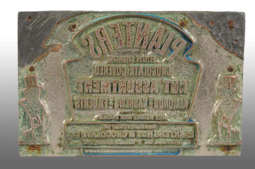 1930s. Very unusual large printers block, which advertises Planters High Grade Chocolate Covered Nut Assortment. Block would have been used on candy box that was to hold a one pound nut assortment. Minimal wear to printers block. Condition (Near Mint). Size 4 - 1/2" W.