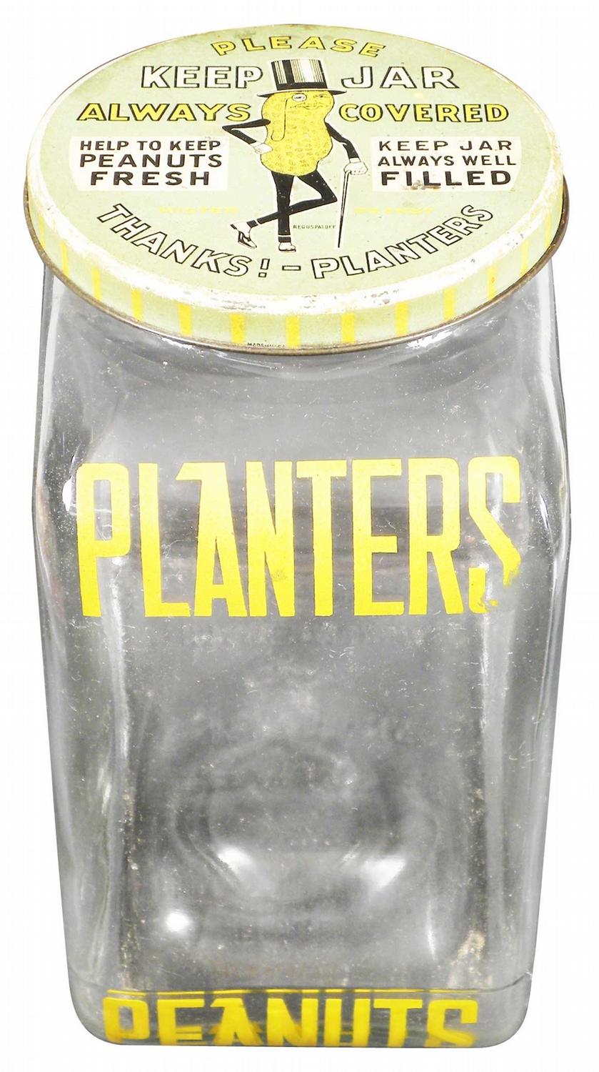Planters Peanut Store Jar with tin lid. No chips or cracks Some paint loss to lid otherwise very good condition. 5 X 7 X 9 1/2 inches.