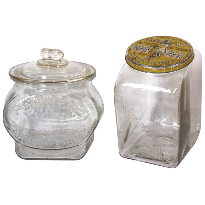 Planters Peanut jars (2), embossed slant shape w/tin lid & embossed 'football' w/glass lid & peanut knob (some roughness on lip), both in VG cond, 9.75"H.
