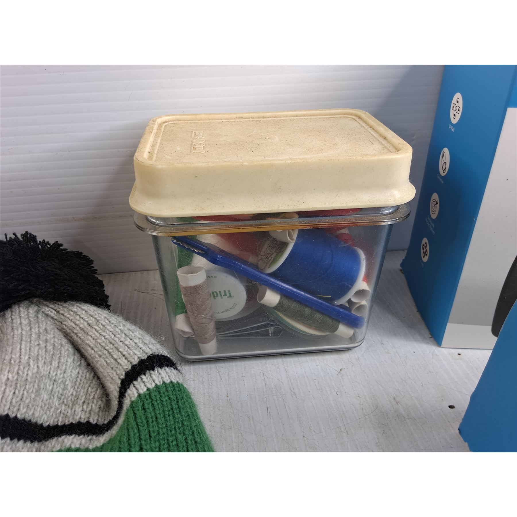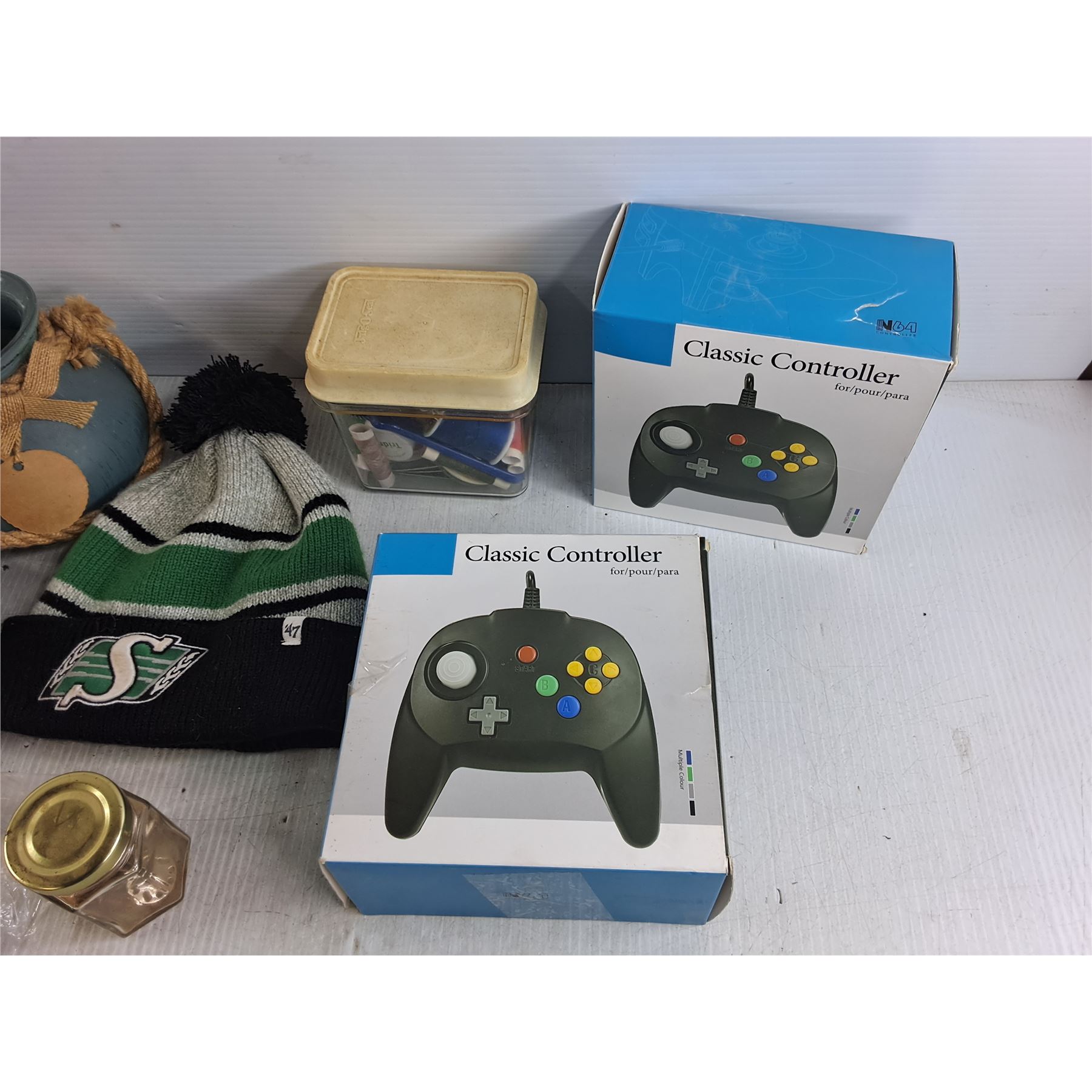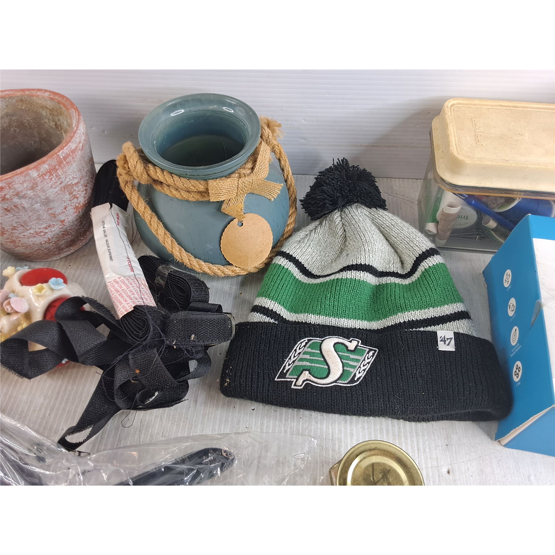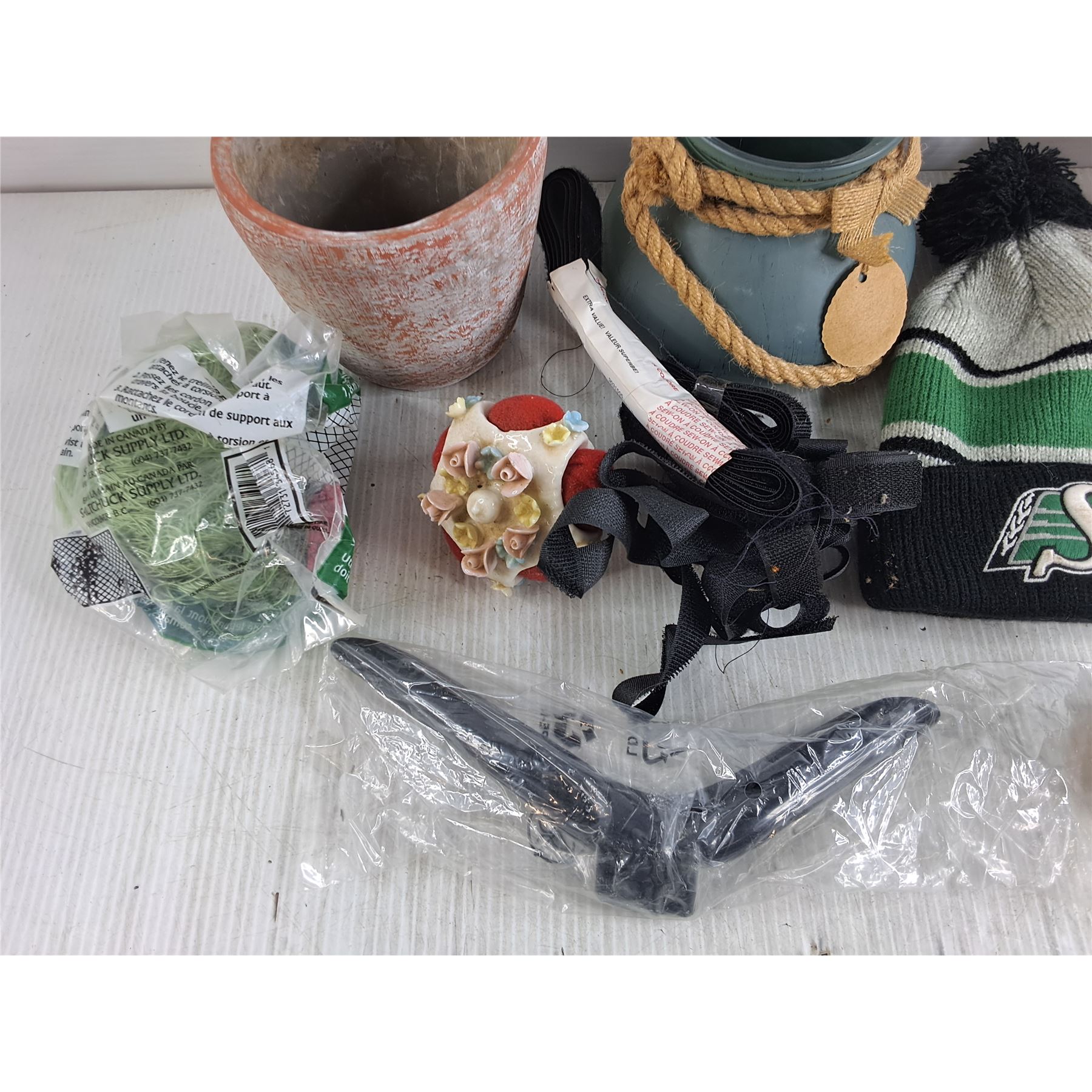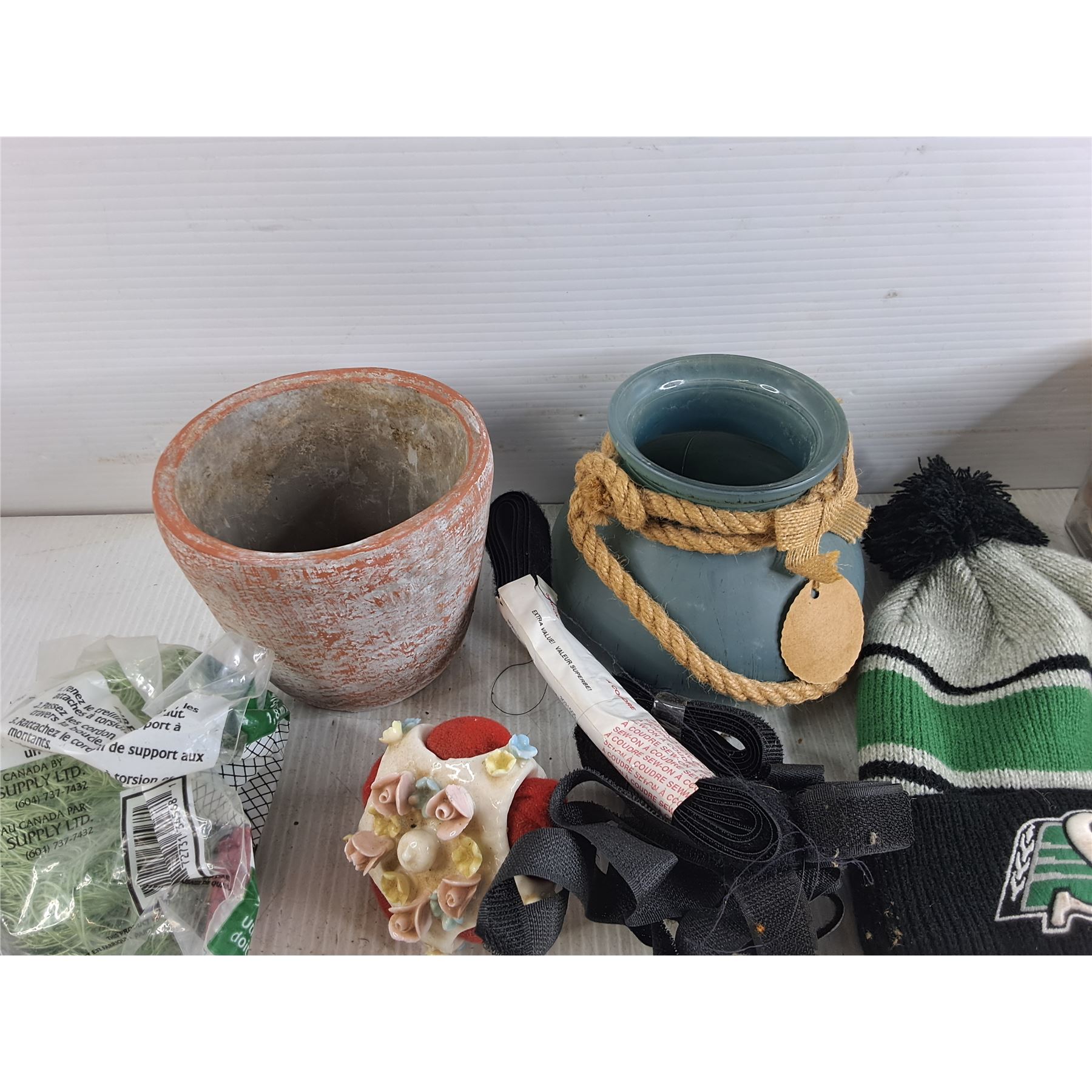 Planters, Saskatchewan Roughriders Winter Hat, Corded Controllers, Various Sewing Supplies