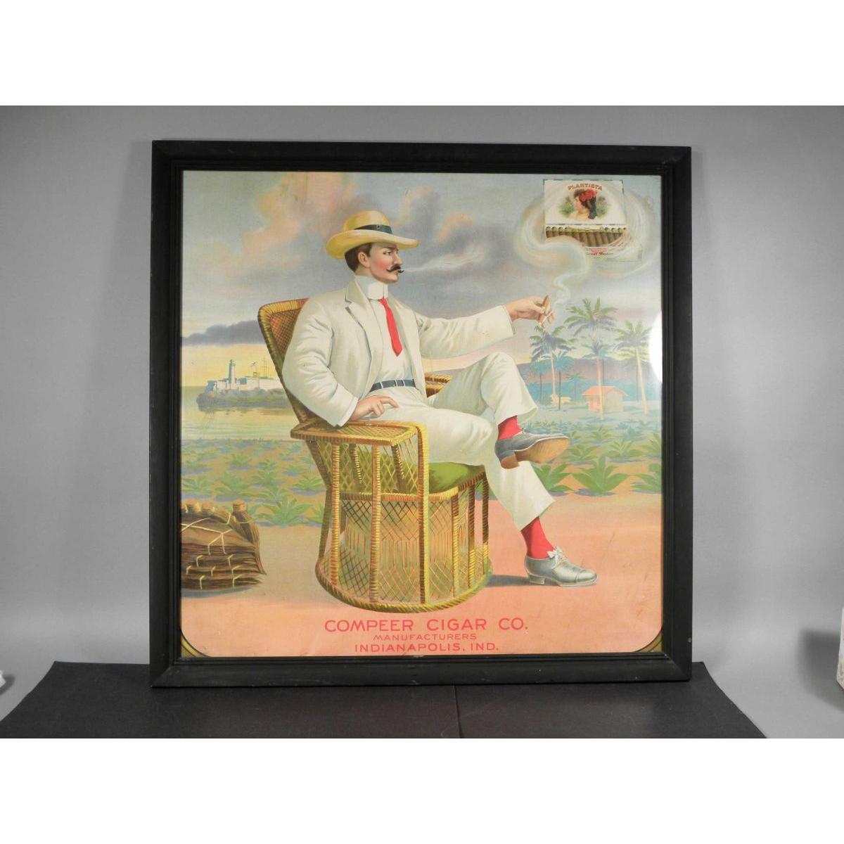 Plantista Cigar Cardboard Sign. Compeer Cigar Company, Mfgs Indianapolis, IN. Possibly easel back or part of a tri fold window display. The only one we have ever seen. Some light staining and nail hole in gentleman's hat otherwise good condition. Framed under glass. 26 X 26 inches image only.