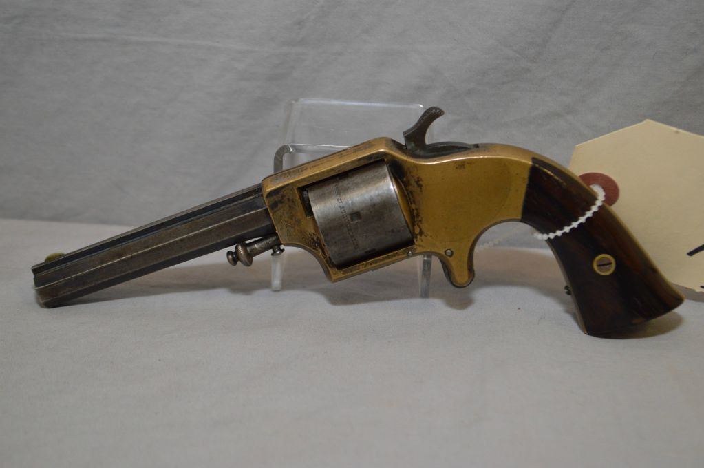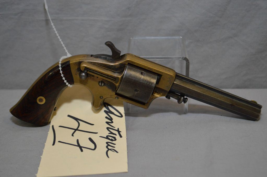 Plants Manufacturing Model Front Loading Pocket .30 Cal 6 Shot Revolver w/ 3 1/2" octagon ribbed bbl [ fading blue finish, brass frame with spur trigger, rosewood grips with square butt, barrel marked Eagle Arms Co. New York, cylinder marked Patent Date July 12, 1859 and July 21, 1863, loading slot in the front of cylinder on right side of the frame / receiver, for front loading of a cup primed cartridge, ejector housing & ejector with round knob handle is affixed to the right side of the receiver/ frame behind the cylinder, Circa Mid 1860's, Total Estimate Quantity 20,000 ] Ser # 5004 ANTIQUE NO PAL REQ